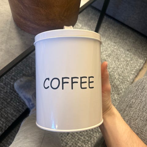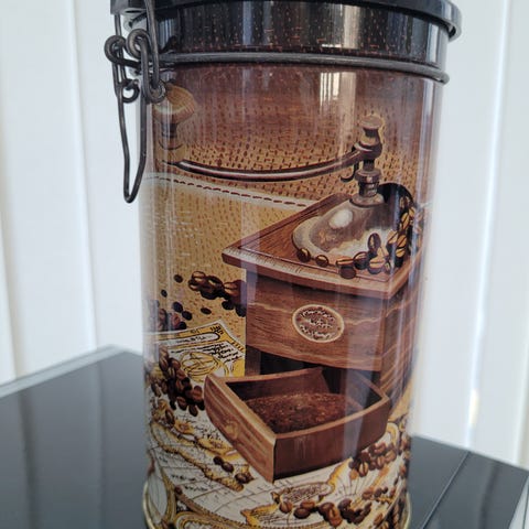 Vi har for salg en kaffeboks i tuppervare H 20 Ø 14 cm.