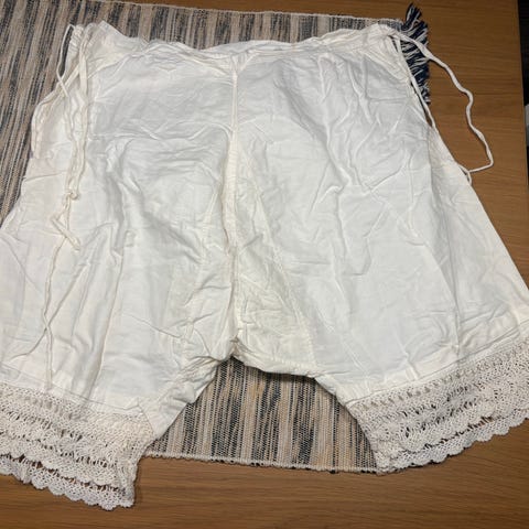 Undrtrøye/bukse (en slags "jumpsuit" for slank kvinne. Jeg antar at plagget er av bomull. Det er svært gammelt og har åpning bak (se bilder) for å kunne gå på do.
