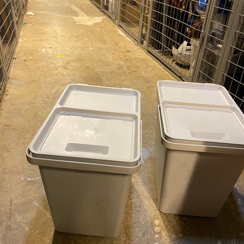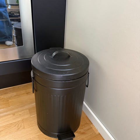 To søppelbøtter/avfallsbøtter, en med lokk. 30 cm høye uten lokk, 18x23 bredde/dybde