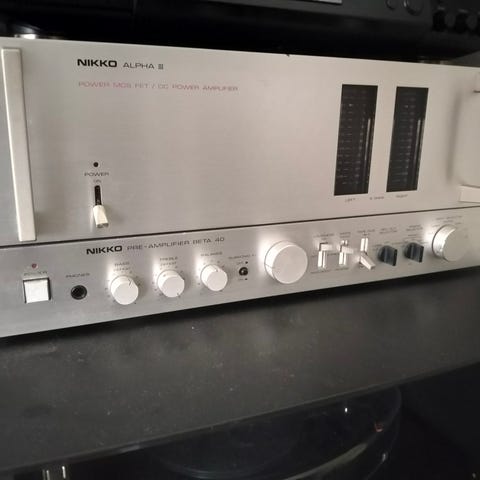 Nikko NT-2000 AM/FM stereo tuner med digital frekvensvisning og flere innstillingsknapper for stasjoner. Nikko NA-2000 integrert stereo forsterker med bass, diskant og balansekontroller, samt flere inngangsvalg som tuner, tape, phono og aux. Enhetene er i sølvfarge og designet for stereo lydoppsett.små fungerer fint .