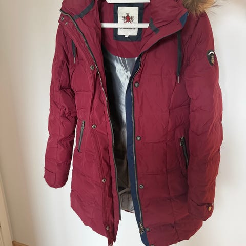 Ytterjakke i dun i nydelig rødfarge fra det norske designer merket Haust str 36. Jakken kostet kr 3599 i butikk. Trenger muligens en rens før bruk og mangler det ene glidelås merket på lommen. Selges derfor rimelig.