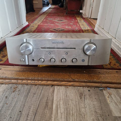 Marantz PM350 stereoforsterker med justerbare bass-, mellomtone- og diskantkontroller, volumkontroll, balanse- og inngangsvelger. Leveres i sølvfarge.