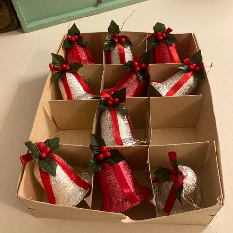 Gammelt svenskt juletre i tre, med røde lysholdere. Det mangler noen metallinnsatser og toppholderen mangler, ellers pent. Til vanlige lys.