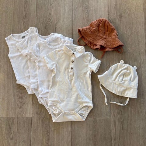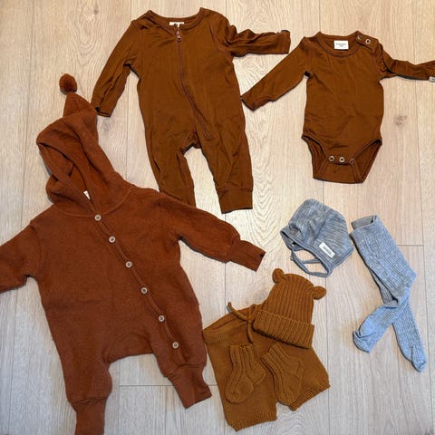 Omslagsbody i ull fra Hust & Claire, strikket lue i alpakka garn, og bomullslue fra Newbie.