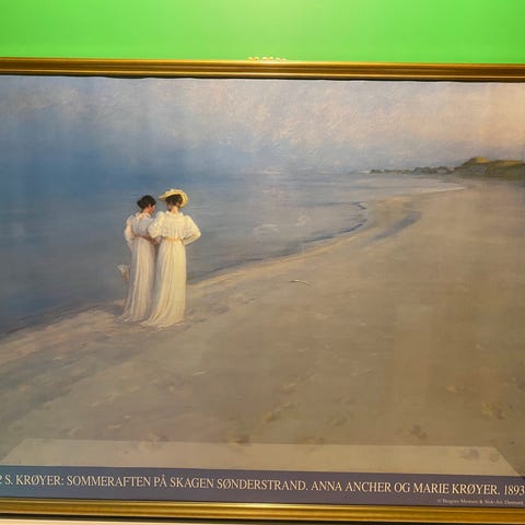 Selger plakat av det skjønne Sommeraften på Skagen Sønderstrand av Peder Severin Krøyer. I ramme, hvit med sølvstripe, 250 kr.