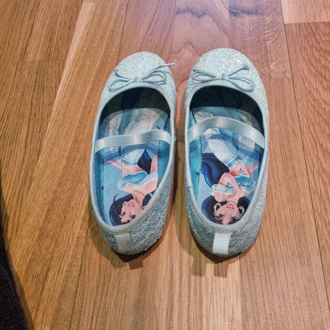 H&M sko for jente i størrelse 33. Skoene har en sølvfarget overflate med glitter og en stropp over vristen for bedre passform. Innvendig fôr har et fargerikt mønster.