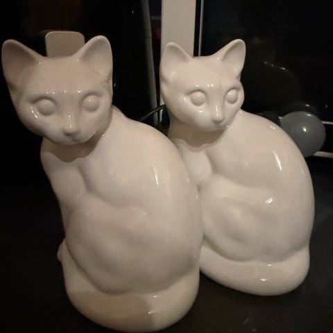 Selger 3 stk like kattefigurer, 2 sorte og 1 hvit. Høyde ca. 17 cm og lengde ca. 22 cm. Bredde ca. 11 cm. Disse kan du ha diverse oppi. Blomster, eller bomull eller andre ting fra badet, eller annet. Kattene er blanke og hele. Selges for kr 120 pr. stk. Eller samlet for kr. 280. Se gjerne alle mine andre annonser på Finn.. Men, jeg sender desverre ikke.