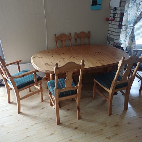 Selger et solid og pent kjøkkenbord i heltre (furu), komplett med 6 tilhørende stoler. Bordet er uttrekkbart og kan forlenges med ileggsplate i midten, noe som gir ekstra plass ved behov ideelt både til hverdagsbruk og når du har gjester.