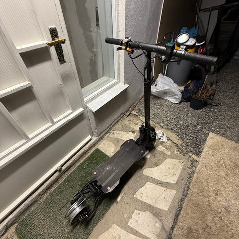 Denne fungerer akkurat som den skal, og får seg lett opp i 40km/t. Det er noen synlige bruksmerker på den men mye er byttet, inkludert styrestaget, foldemekanismen, bakskjermen og mere. Den har også fått seg en rød "styling" med helt nye deler.