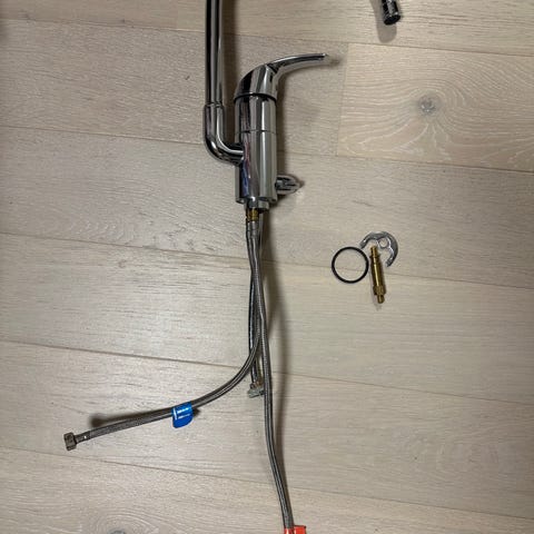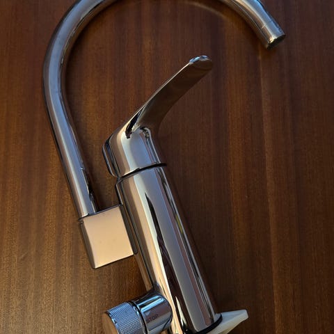 Kjøkkenarmatur i metall med et enkelt design. Passer til montering på kjøkkenbenk eller vask. Produktet har en standard størrelse for kjøkkenarmaturer.