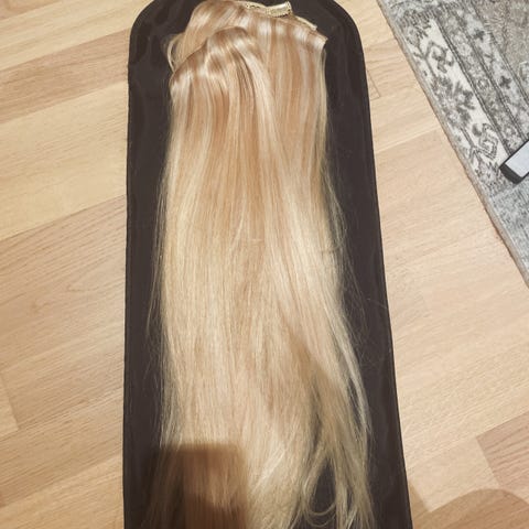 Hairband med clips og trense. Farge lys blond, 10.8 Lengde 50 cm. Helt nytt, kun åpnet og sett på. Selges pga endring av min hårfarge.