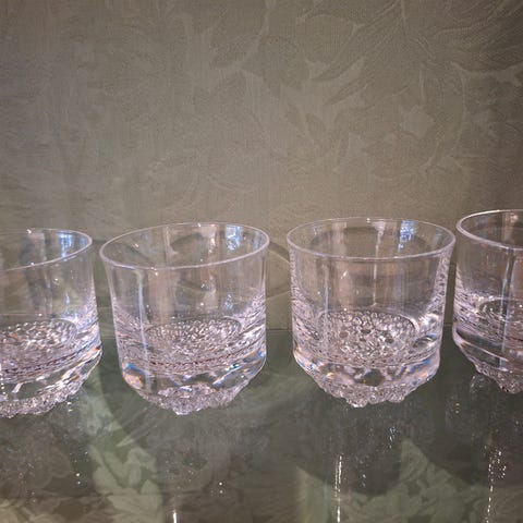 Vakkert sett med Svalbard whiskyglass designet av Willy Johansson for Hadeland Glassverk. Klassisk, tungt glass med karakteristisk is-/fjellstruktur i bunnen.