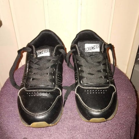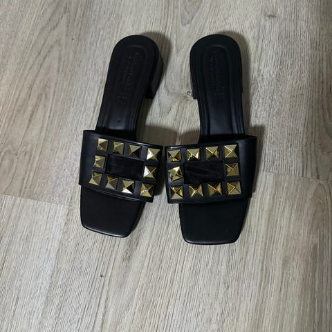 Flotte skoletter i semsket skinn, brukt bare noen få ganger, ingen merker. Hælen er 8,5 cm, stødige og gode å gå i, god såle og lett foret. Flott med gullfarget glidelås. Laget og kjøpt i Spania.