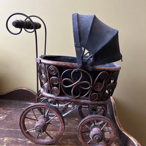 Miniatyr handlevogn i metall med turkis håndtak. Egnet som dekorasjon eller til oppbevaring av små gjenstander.