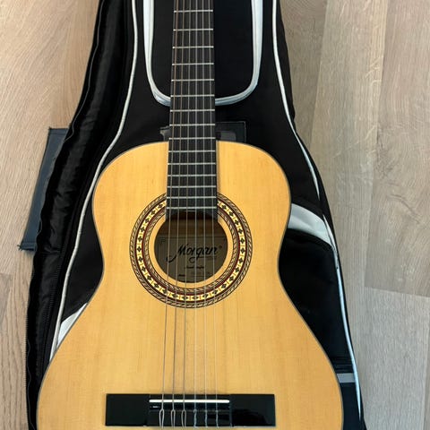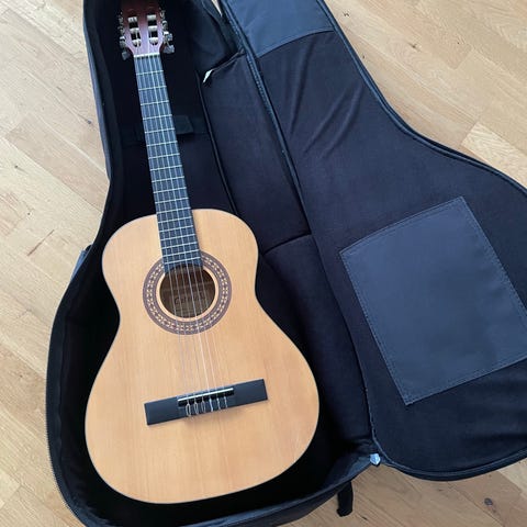 Barnet i huset prøvde ut gitarspilling noen få ganger, men interessen var ikke tilstede så vi selger den til noen som får brukt for den. Har blitt oppbevart i beskyttelse bagen. Ingen skader