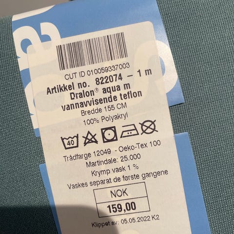 Metervaren er sertifisert i hht. STANDARD 100 by OEKO-TEX®. OEKO-TEX® er verdens ledende merking for produktsikkerhet og bærekraft innenfor tekstilindustrien. Når metervaren er sertifisert i henhold til STANDARD 100 by OEKO-TEX® er det din garanti for at den er testet og godkjent, og uten noen former for skadelige kjemikalier.