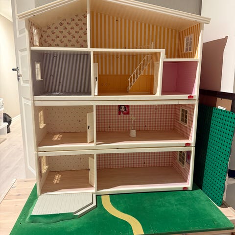 Nytt Lundby Dukkehus selges... Har stått urørt med møbler i... Dessverre va vi uheldig å teipet en lyslenge rundt og inni, som ga noen sår på tapet når den ble tatt av..