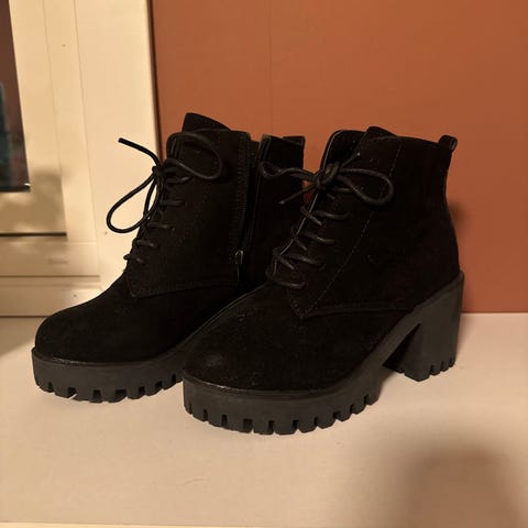 Hæler svarte støvletter i størrelse 37 med glidelås på siden. Laget i semsket materiale med blokkhel. Egnet for bruk ved ulike anledninger.