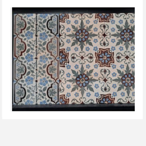 Unike kjeramiske art nouveu fliser fra ca 1920 bestående av 551 stk fliser med dekorative mønstre i fargene rød, beige og grønn. Inkluderer 426 midt fliser, 125 rød og beige kant flis og 105 grønn og beige kant flis.