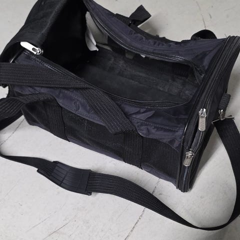 Selger en bæreveske som var fin å bruke i valpetiden. Den er 41×21×26 cm og har en pute i bunn av vesken og et feste til halsbånd. Fargen er mørk blå.