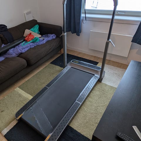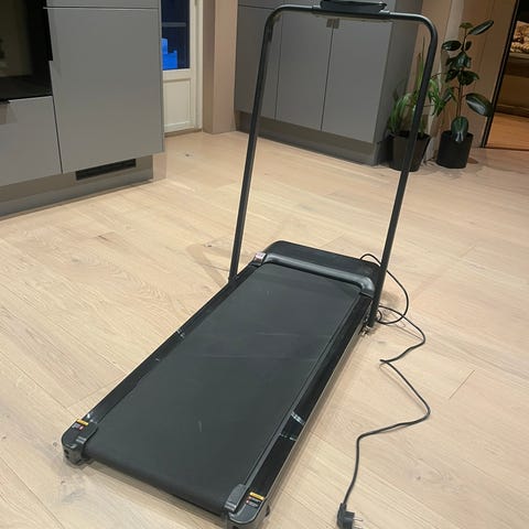 tredemølle i svart farge. Utstyrt med en kontrollpanel med modusvalg, start/pause-funksjon og av/på-knapp. Designet for innendørs gange og trening.