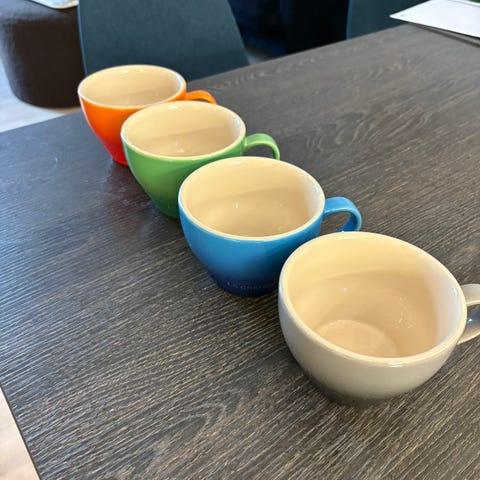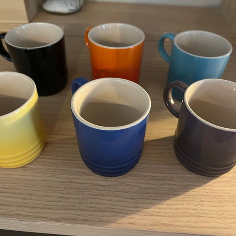 Fint brukte koppar frå Le Creuset i farge volcanic (2 stk) og deep teal (2 stk). Flotte koppar i god kvalitet!