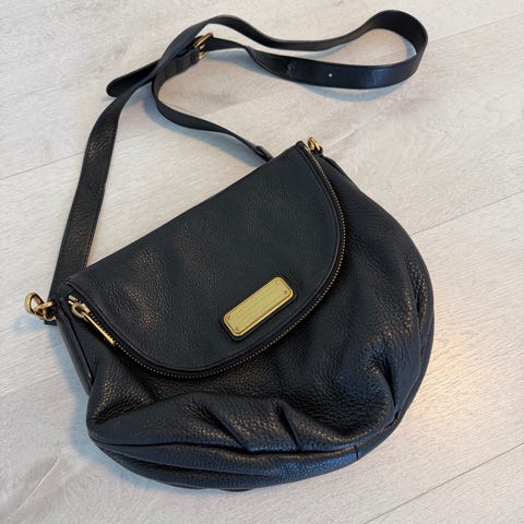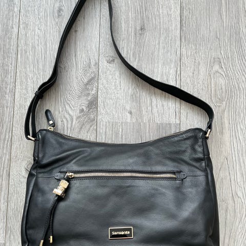DKNY dameveske laget av svart skinn. Vesken har en justerbar skulderrem og flere innvendige lommer for organisering. Egnet for daglig bruk og ulike anledninger.
