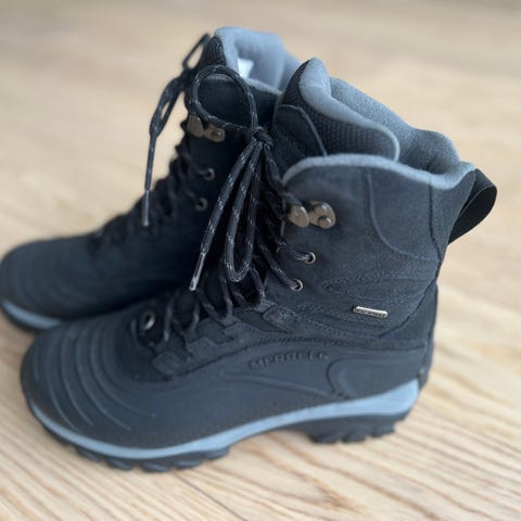 Merrell J06099 fotturstøvler i størrelse 38.5 selges rimelig! Støvlene er designet for utendørsbruk/fotturbruk og har solide såler for godt grep og har en teknologi som fungerer meget godt på is (piggstøvler uten pigger)! Fargene svart og grått med mørk rosa detaljer. Veldig lite brukt og fremstår som meget pene!