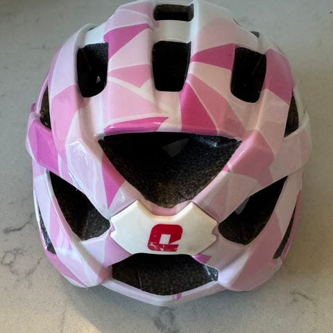 Sykkelhjelm i hvit farge med rosa blomster mønster. Hjelmen har flere ventilasjonsåpninger for lufting. Passer for barn eller voksne avhengig av størrelse.str S 48-