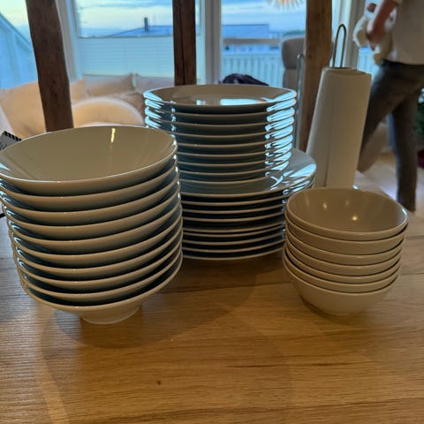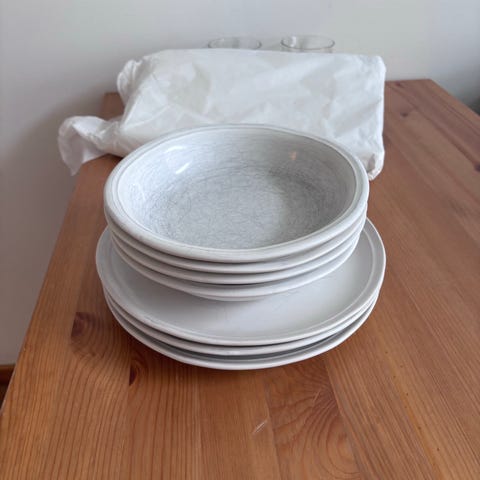 Pent brukt, 8 middagstallerkener, 8 frokosttallerkener og 5 boller, i dusty green farger, selges fo 500kr.