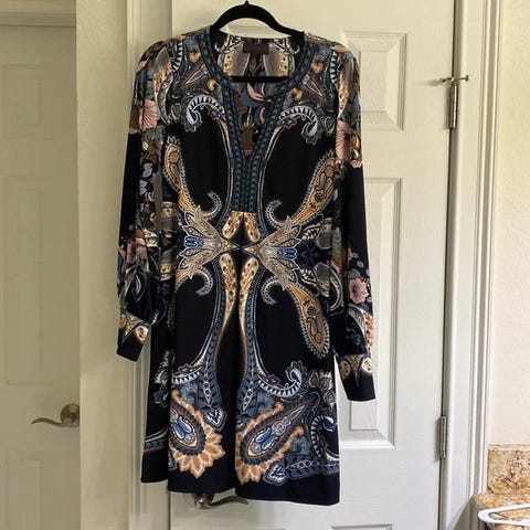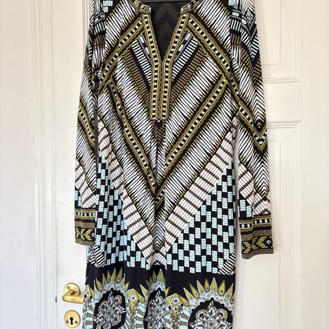 Hale Bob i størrelse M, flerfarget mønster og laget av polyester. Kjolen er brukt en gang. Henger i skap i røyk og dyrefritt hus. Kjøpt på "Suser i Sivet" Tønsberg. Kostet over 3000.- så dette er et skikkelig røverkjøp.