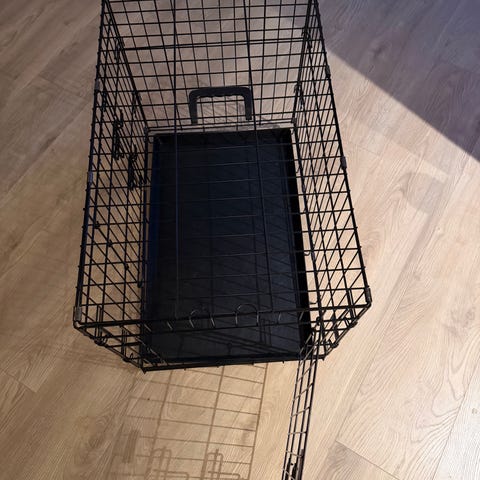 Sammenleggbart hundebur i svart metall med avtakbar plastbunn.