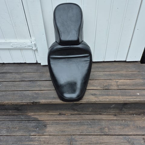 Harley Davidson Sportster XL onedrive seat i svart skinn med hvite sømmer. Setet har metallfester for montering.