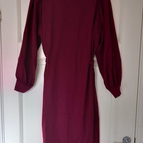 Va Vite Rachel hverdagskjole i størrelse L, fargen vinrød. Laget av 70% polyester, 25% viskose og 5% elastan. Kjolen har lange ermer og rund hals, med glidelås på baksiden. Egnet som hverdagsplagg.