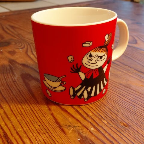 Arabia Mummi krus med motiv av Mummitrollet. Kruset er laget av keramikk og har en gul bakgrunn med fargerike illustrasjoner. Passer til daglig bruk som drikkekopp.