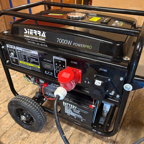 Leier ut et Hyundai HY10100LEK-T, et kraftig bensinaggregat fra Hyundais Proff-serie. Dette er ikke et lite camping-aggregat, men en maskin bygget for å drive tungt verktøy, kompressorer, sager og utstyr som krever høy effekt. Maskinen leverer inntil 8000W og kan enkelt veksles mellom 3-fase (400V) og 1-fase (230V) med en bryter.