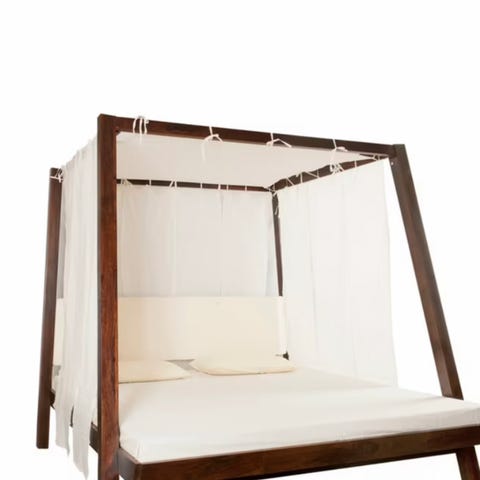 Himmelseng i mahogny med fire søyler og kappe og gardinoppheng. Passer som dobbeltseng i soverom. Gir en unik stil til rommet.