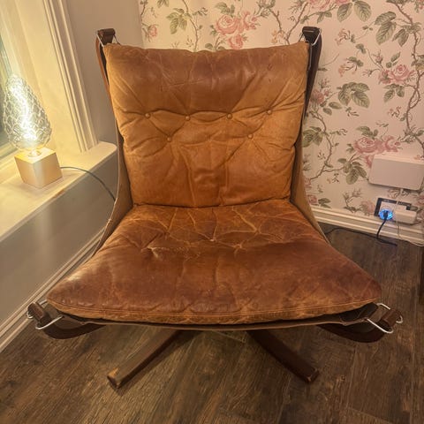 Vi selger vår (veldig) kule Falcon stol fordi vi flytter og ikke lenger har plass til den. Den er vintage men fortsatt deilig å sitte i. Puten har fått synlige skader etter at en katt har klort i den, mulig dette kan fikses ettersom det er i overflaten. Stolen er demontert og klar for henting.