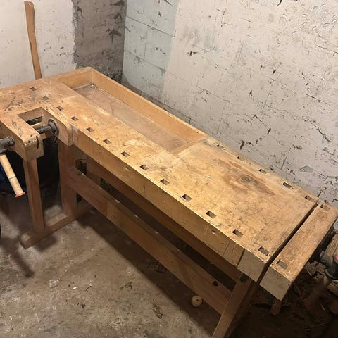Gammel trebenk, sløydbenk. I god stand men godt brukt