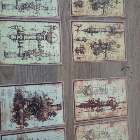 Selger en pakke med 20 unike vintage/steampunk-illustrasjoner – perfekte til veggdekor, scrapbooking, kunstprosjekter, collage eller interiørdetaljer med retro preg.