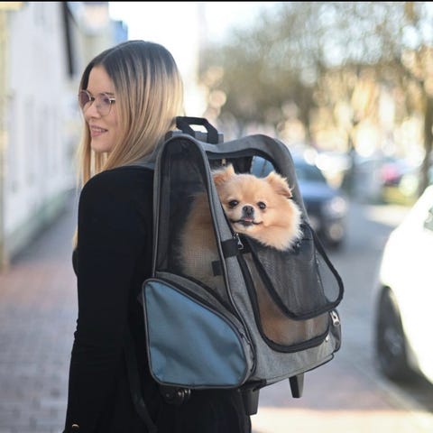 Kerbl dyretransportbag i grå stoff med nettingvinduer for ventilasjon. Bagen har bærehåndtak og skulderrem for enkel transport. Innvendig er det en myk pute som gir komfort for dyret under transport.