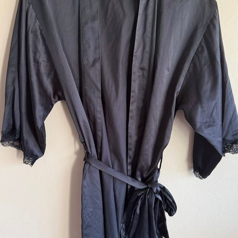 Morgenkåpe i grønn farge, laget av 95% polyester. Størrelse L. Morgenkåpen har lange ermer med blondedetaljer og knyting i midjen.