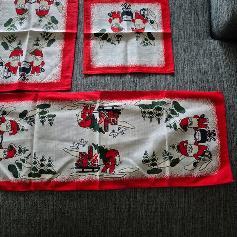 Helt herlig klassisk 1970-talls retro juleduk i strie. Det kan se ut som den har noen hvite flekker, dette er ikke flekker, men ujevnheter fra produksjonen. Den har en bitteliten flekk, ellers veldig fin stand. Ca 92x92 cm.