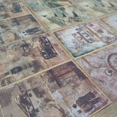 Sett med 8 vintage verdenskart. Kartene har et gammeldags design og er i forskjellige størrelser, med en lengde på omtrent 21 cm. Passer til dekorasjon eller samling.