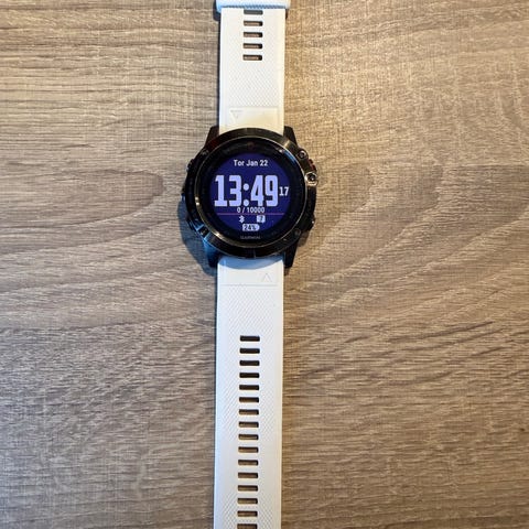 Garmin Fenix 5 smartklokke med svart rem. Klokken har GPS-funksjon og pulsmåler på baksiden. Egnet for aktivitetssporing og treningsbruk.