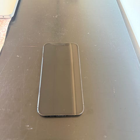 Apple iPhone 12 Pro mobiltelefon med 256 GB lagringskapasitet. Telefonen har en farge i grafitt og leveres med original eske og et svart deksel med magnetisk ladestøtte.