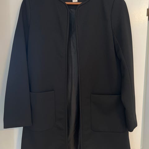 Mørkeblå. Kjempe fint snitt på jakken, med litt polstring på skuldrene som gjør at den sitter veldig fint. Passer som vårjakke eller sommerjakke.