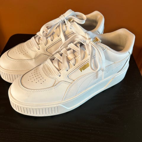 Helt nye sneakers fra Puma. Kun prøvd på, de ble dessverre akkurat litt små. Hvite og freshe, og fint til både hverdags og kjole.