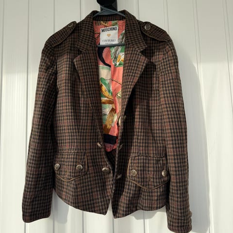 Veldig kul jakke med dobbeltknapp foran, knapper i ermene og to lommer i siden. Det er 30% ull i jakken. Det står at jakken er i str. 38, men passer nok best om du er str. S. jeg er 163 cm høy og jakken rekker til hoftene.
