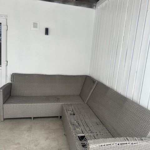 Utemøbel sofa med grå tekstilputer og integrert bord i lys trefarge. Sofaen har plass til to personer og er designet for utendørs bruk. Materialene inkluderer tekstil og metallramme, med et tilhørende sidebord som er festet til sofaen. Et hjørne av sidebordet knakk av, men er limt på igjen - se bilde. flott for balkong